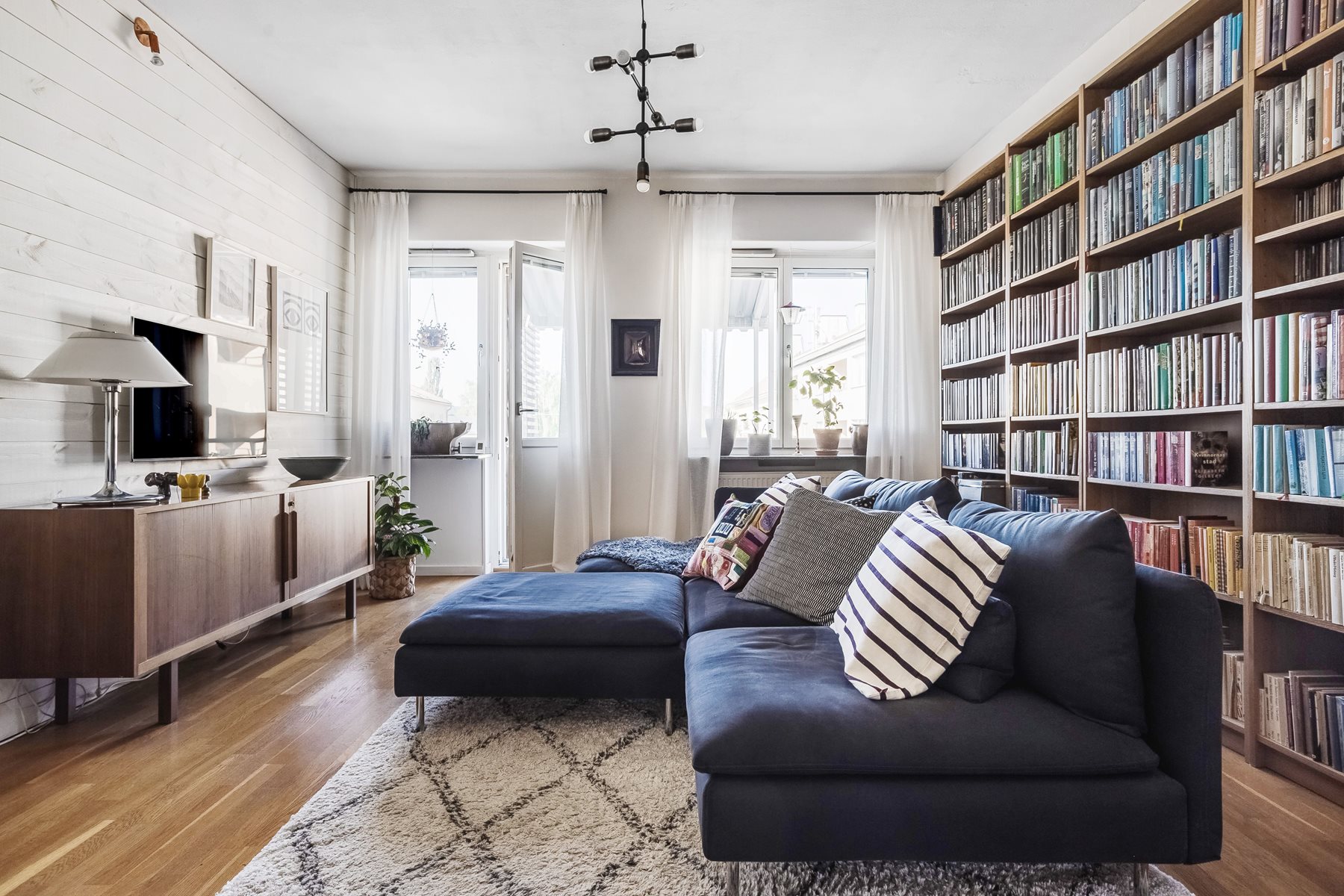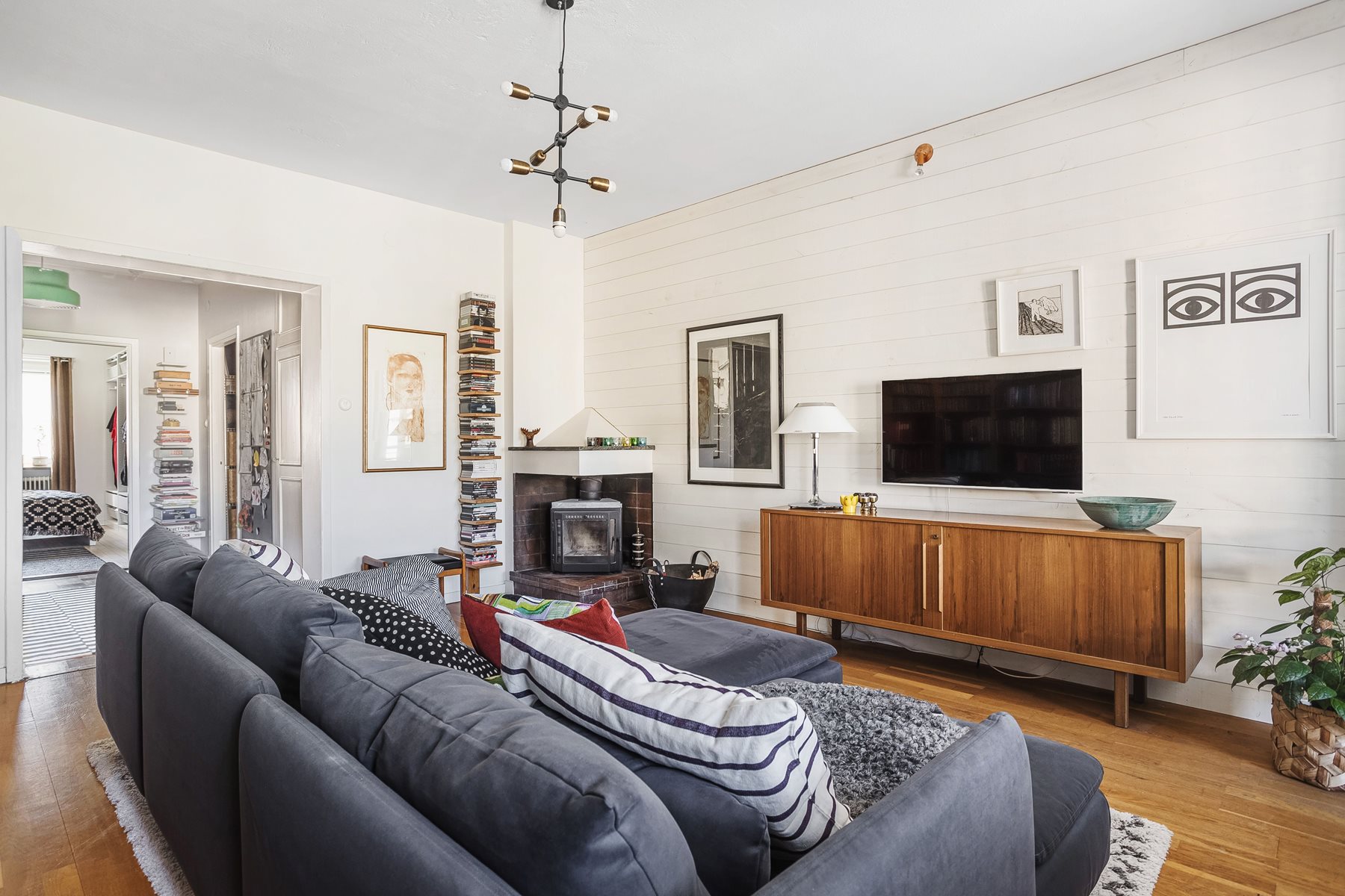 Stort och ljust rum med parkettgolv. Öppenspis med insats. Utgång till balkong med utsikt över Kung Gustafs torg. Ljudisolerad vit panelvägg.