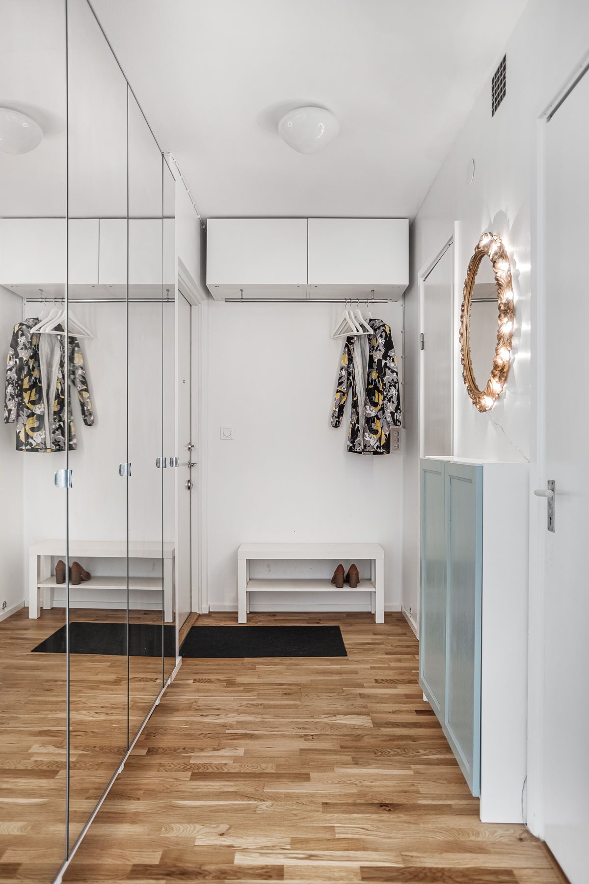 Parkettgolv och ljusa väggar. Garderob.
