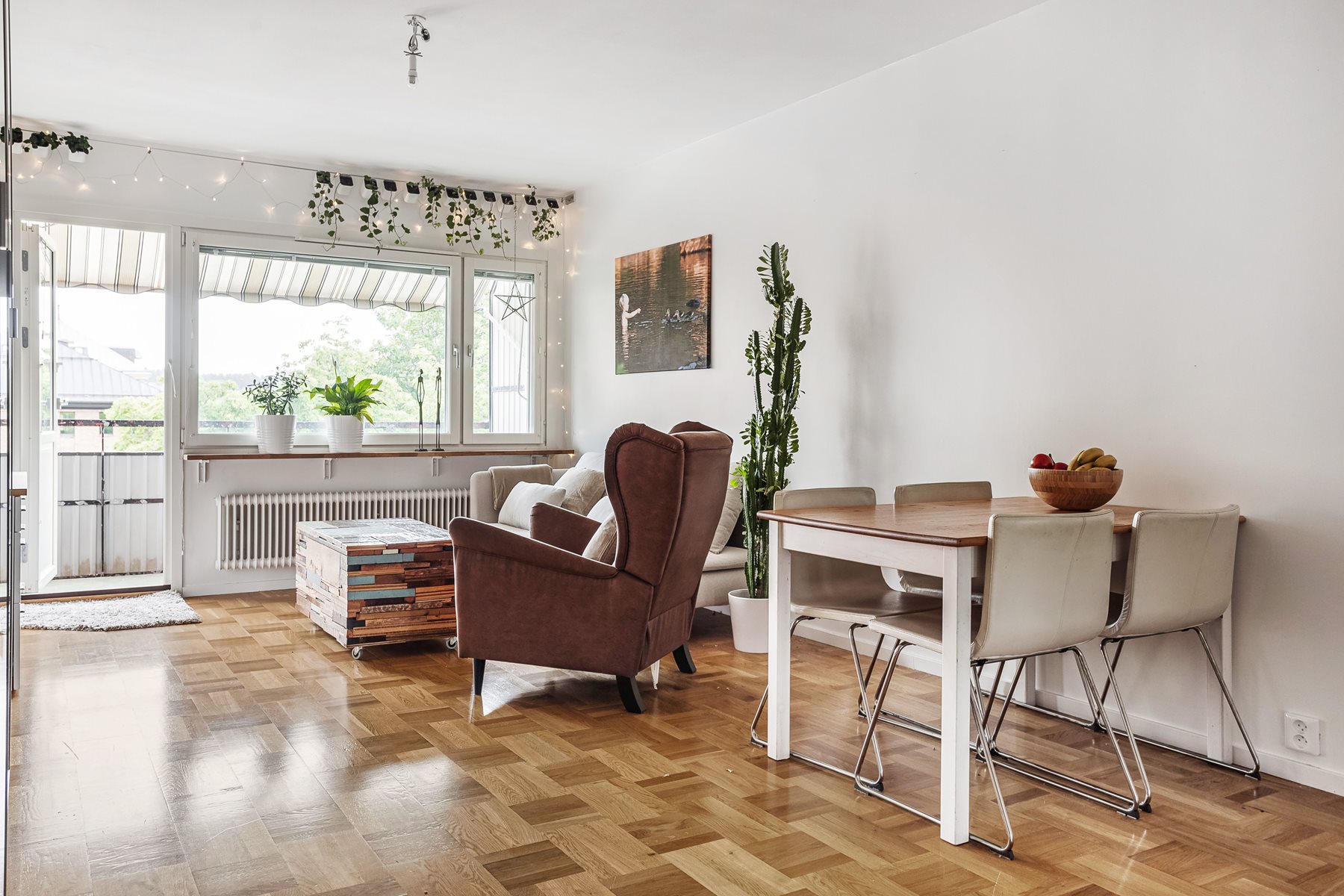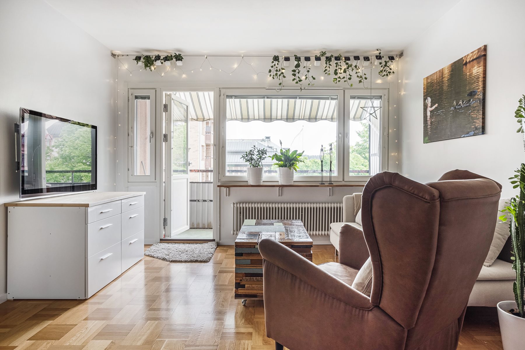 Härligt rum med plats för både matbord och soffgrupp. Parkettgolv och ljusa väggar. Utgång till balkong. Garderoberna som syns på bilden kommer säljarna ta med sig.