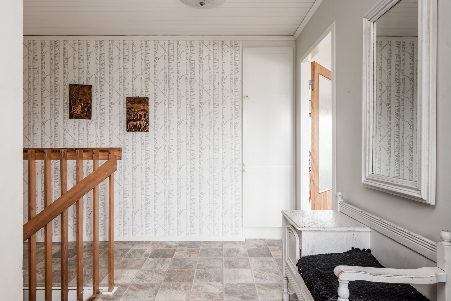 Ljusa tapeter och klinkermönstrad plastmatta. Kappavhäng.