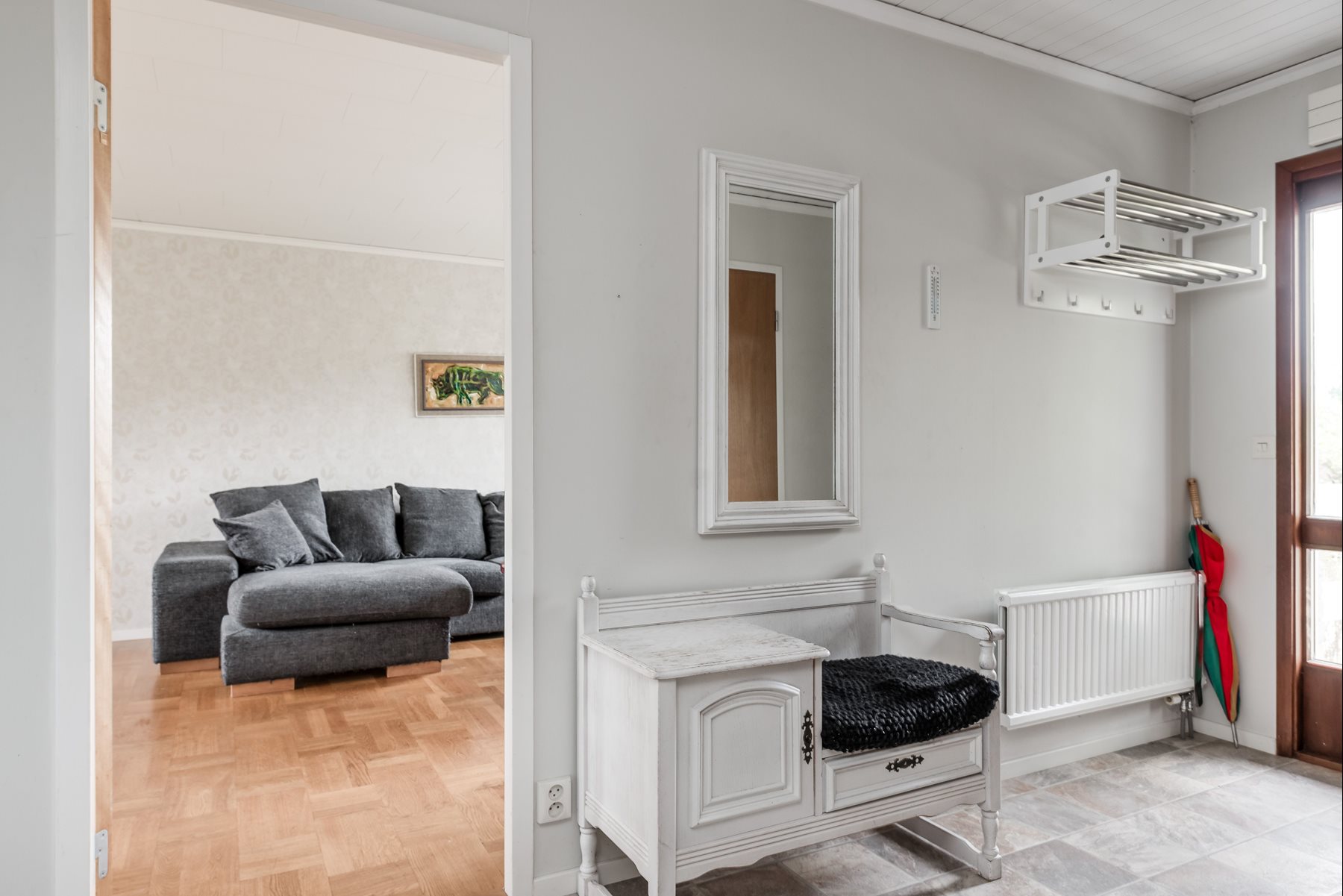 Laminatgolv och ljusa vävtapeter.