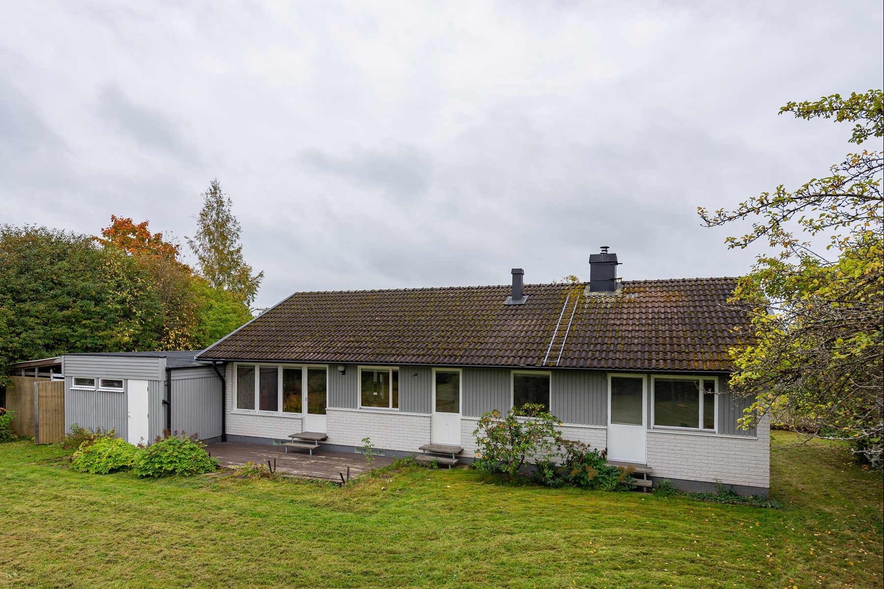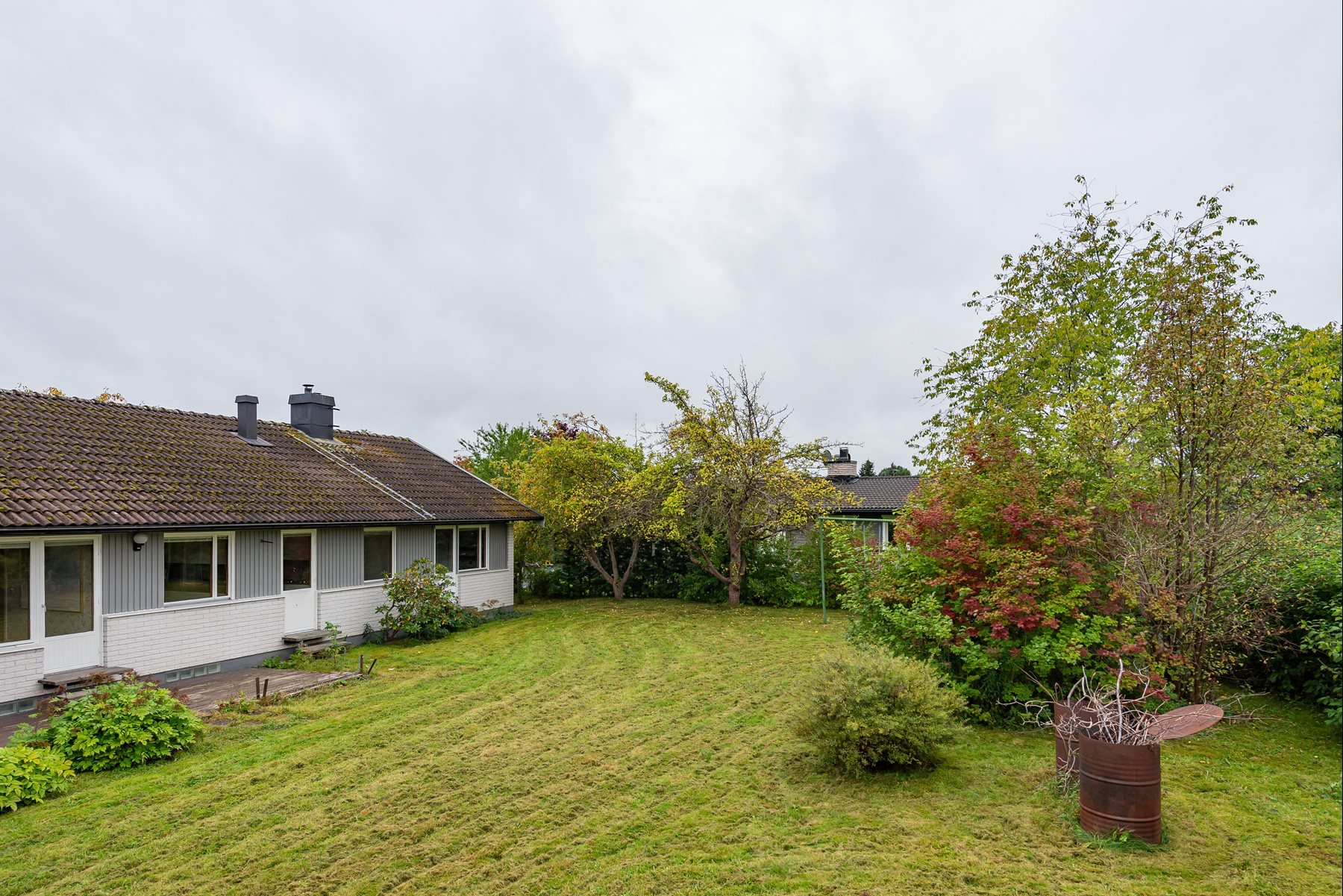 En lummig och skyddad trädgårdstomt med flertalet fruktträd och rabatter. Altan på baksidan där du njuta av en lugn stund i solen.