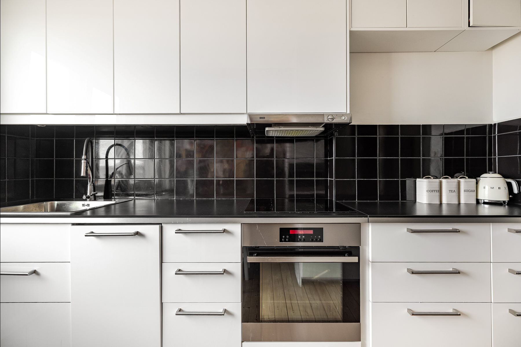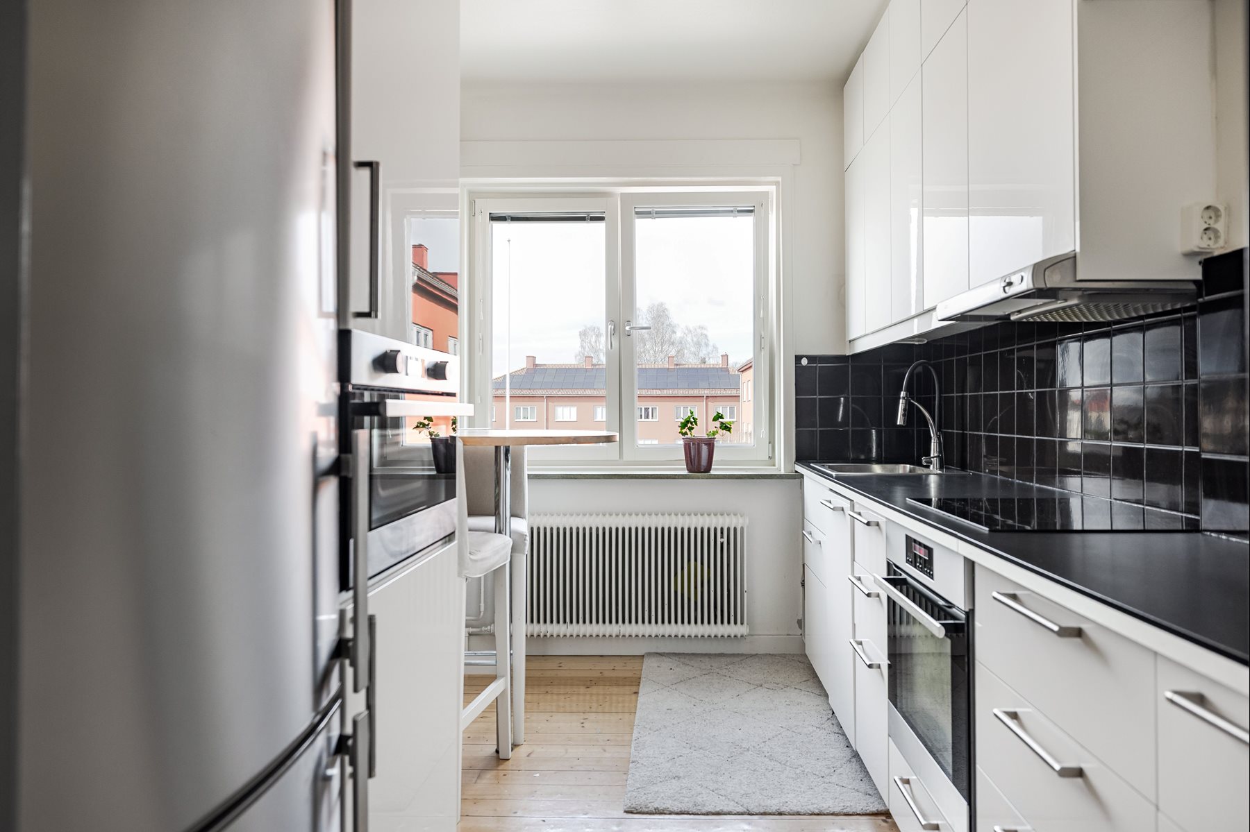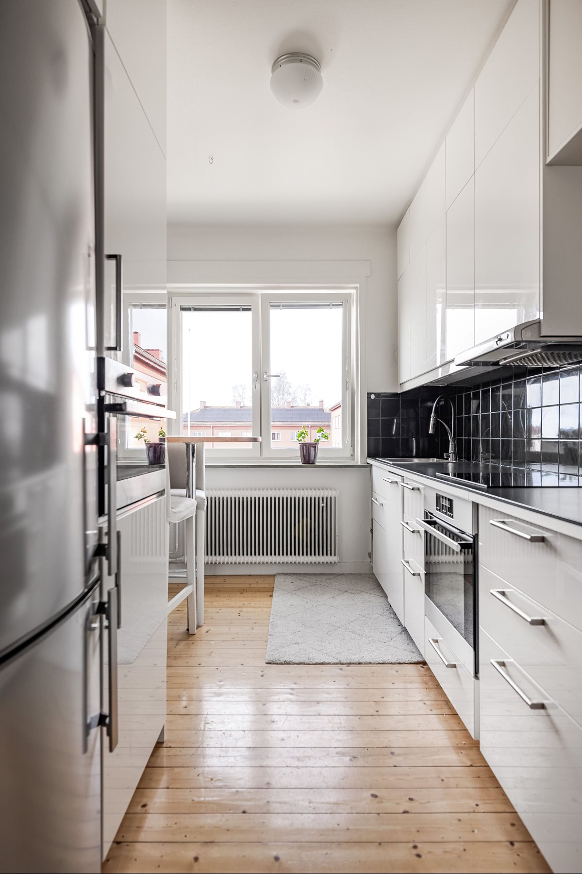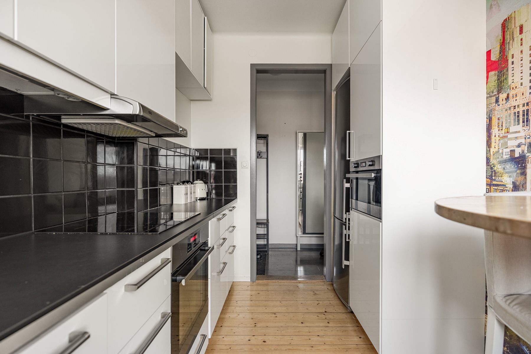 Lägenheten bjuder på en härlig känsla av rymd tack vare högt i tak, generöst ljusinsläpp och vackra trägolv som löper genom bostaden. Det stilrena köket är ljust och modernt med släta luckor och erbjuder en smidig arbetsyta med plats för ett mindre matbord.