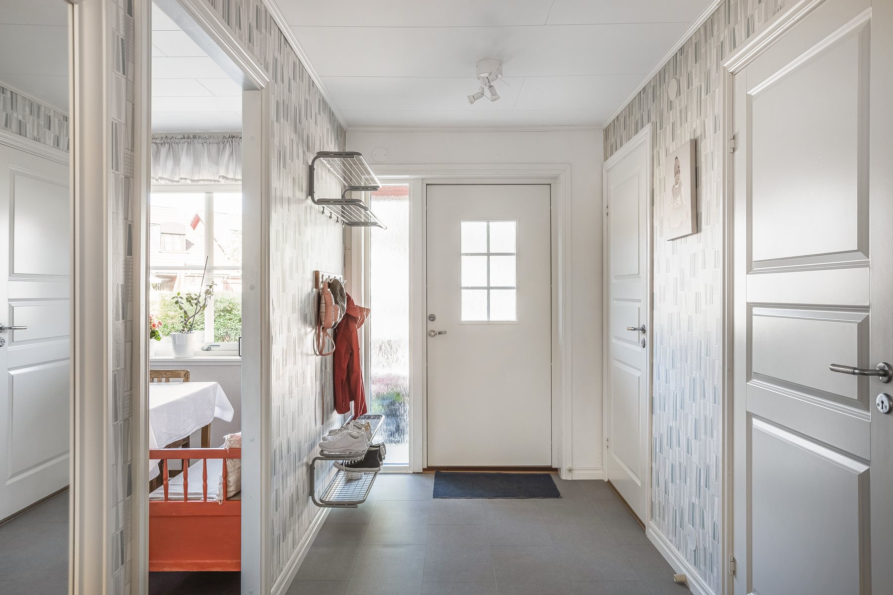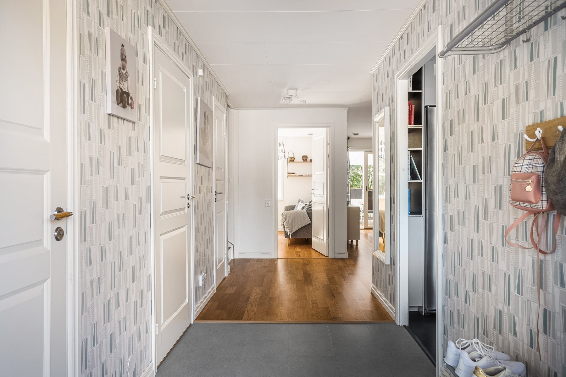 Ljusgrått vinylgolv som övergår i ekparkett. Mönstrade väggar. Kappavhäng. Golvvärme.