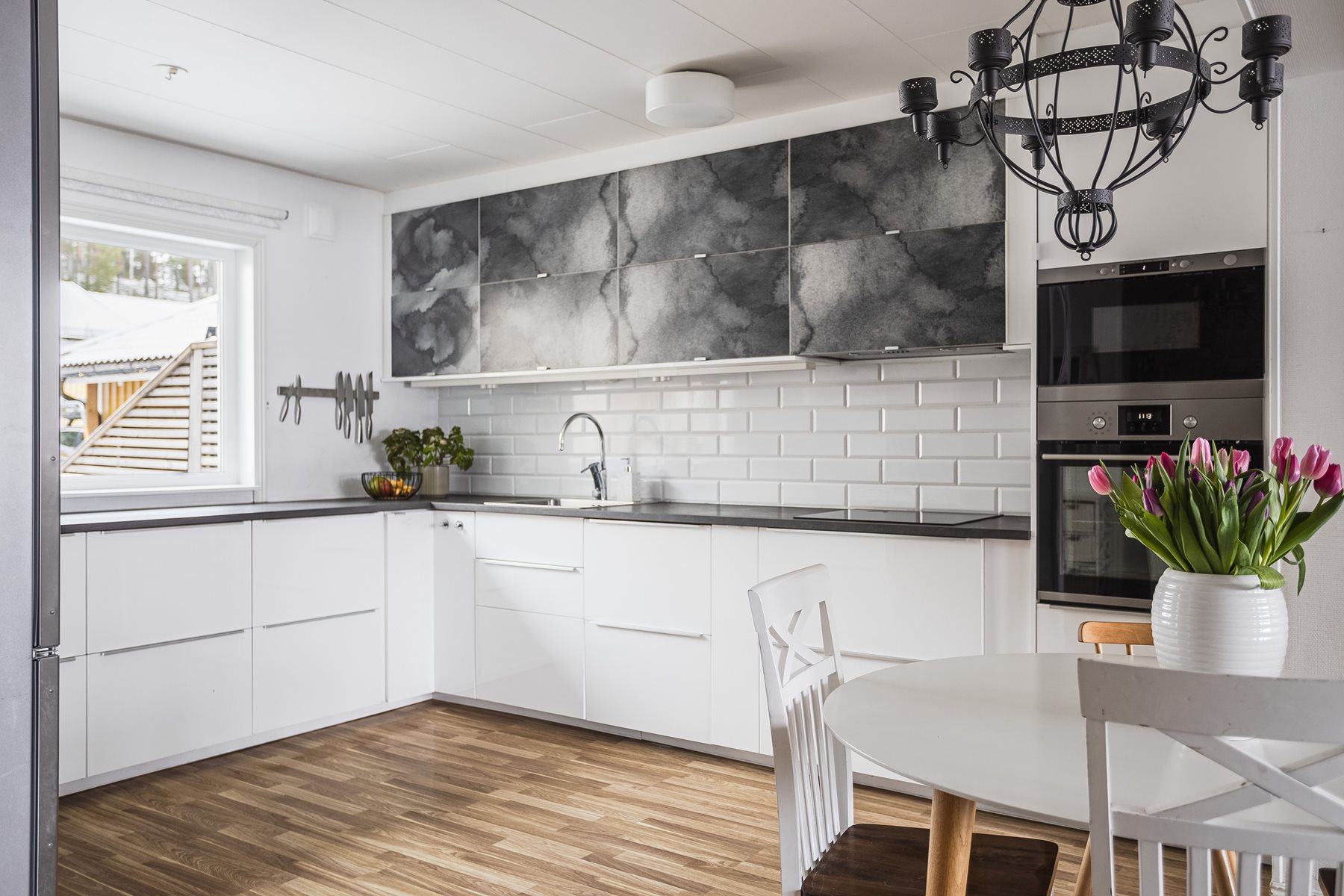 Modernt och stilrent kök renoverat 2017. Ljusa blanka köksluckor samt mönstrade överskåp och bänkskiva i laminat. Utrustat med induktionshäll, fläkt, kyl, frys, inbyggnadsmicro, varmluftsugn och diskmaskin. Generösa arbetsytor och stort fönster mot framsidan som ger fint ljusinsläpp. Laminatgolv och ljust kakel. Öppen planlösning mot vardagsrum vilket ger plats för större matbord.