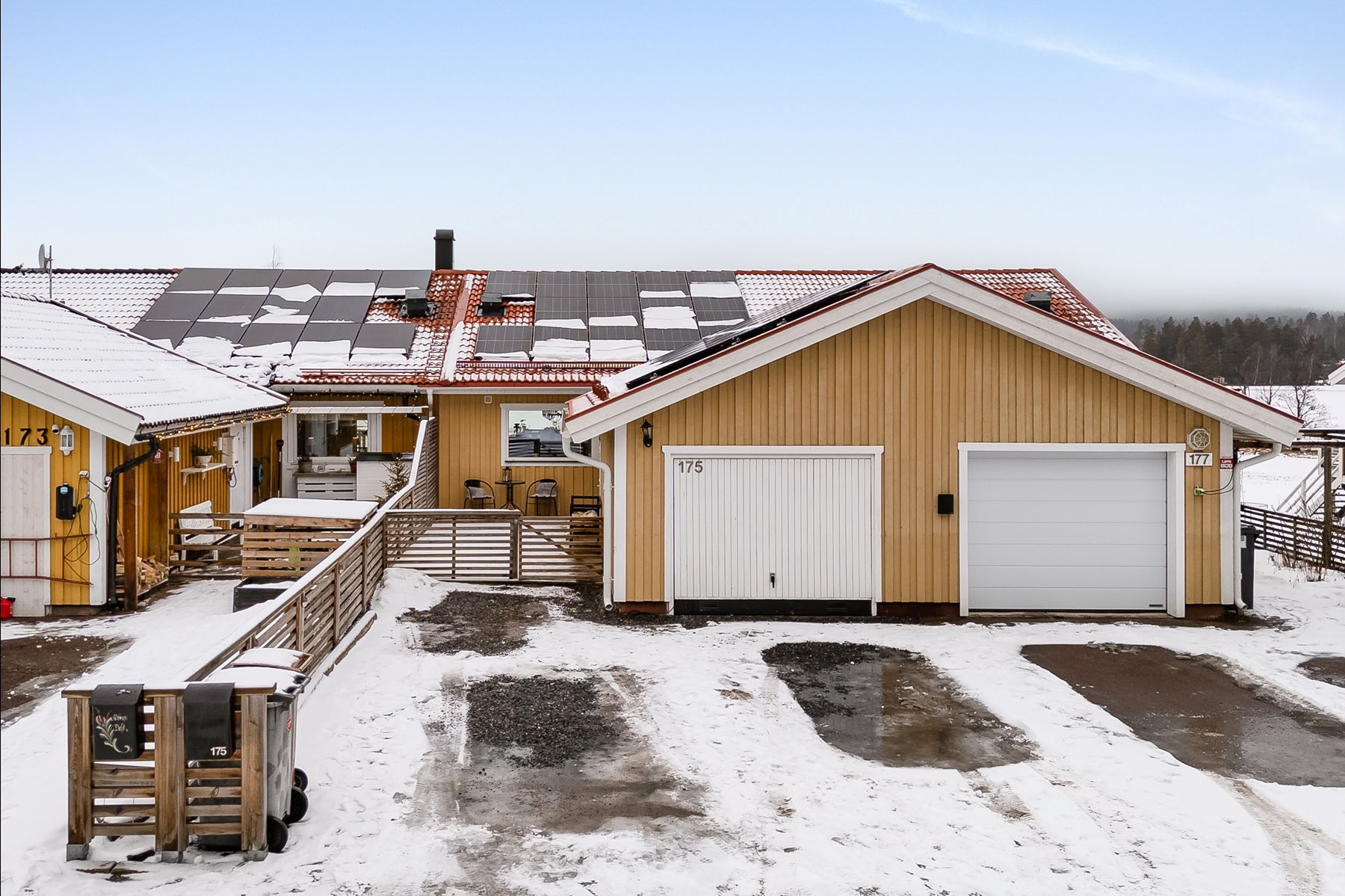 - Rymlig altan på framsidan omsluten av staket med förmiddagssol.
