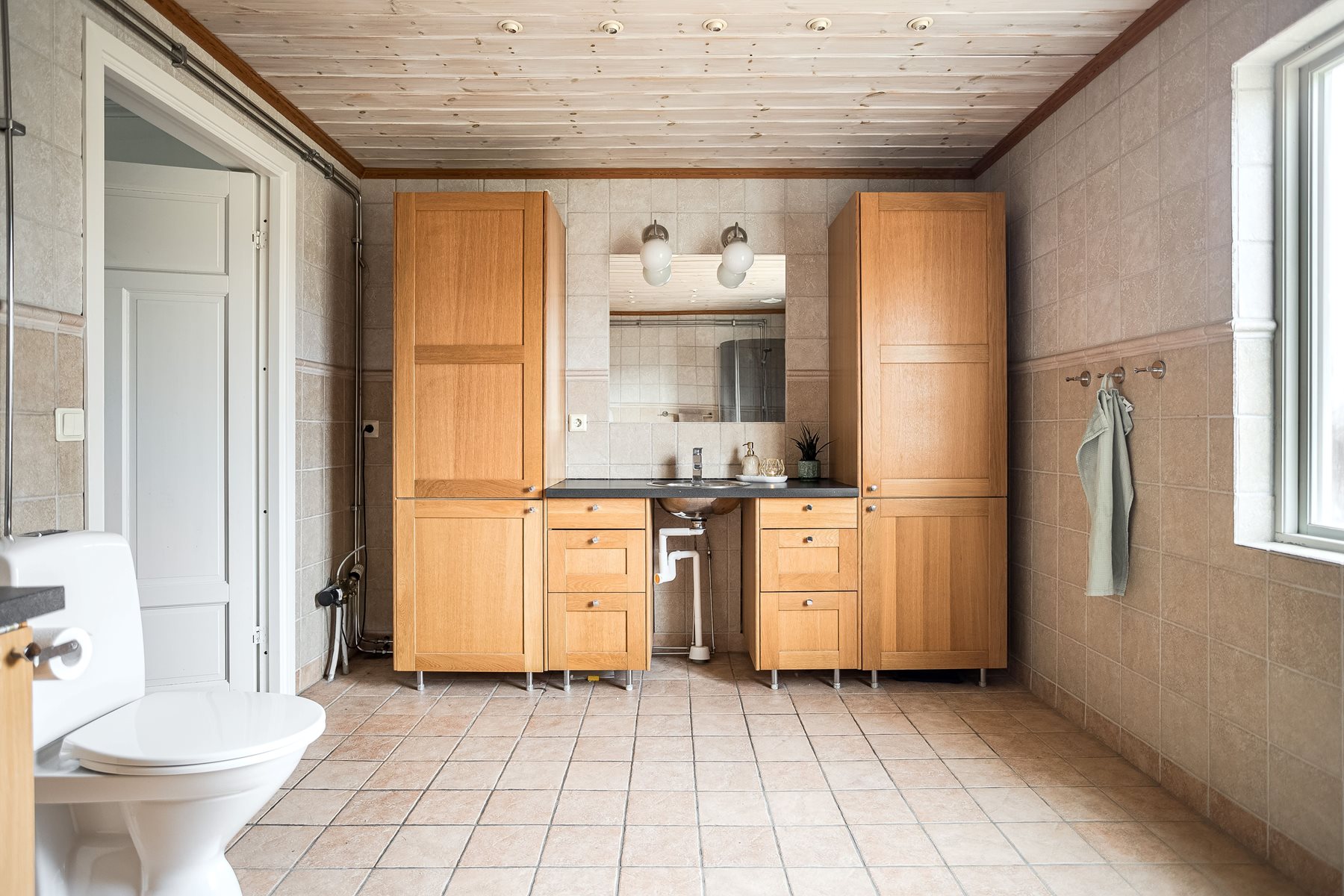 Stort badrum med kakel och klinker. Utrustat med dusch, handfat, toalett och tvättmaskin. Arbetsbänk och förvaringsskåp. Golvvärme.