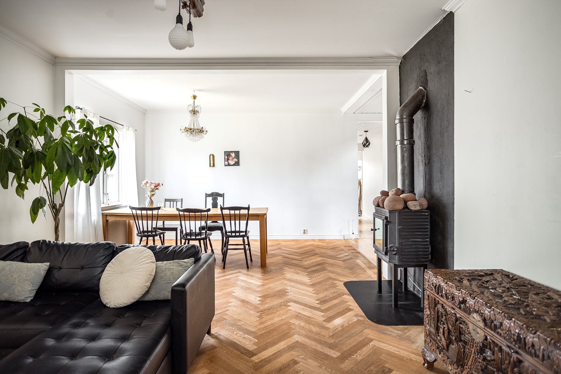 Planlösningen erbjuder gott om utrymme för den som vill tänka stort – med fyra sovrum, ett rymligt vardagsrum med vacker fiskbensparkett och en stämningsfull gjutjärnskamin som ger karaktär och charm. Det svarta köket är fullt funktionellt och rustikt, men här finns också möjlighet att renovera eller bygga om för att skapa ditt drömkök. Från köket leder en dörr ut till altanen i sydostläge – ett underbart läge för sommarhäng.