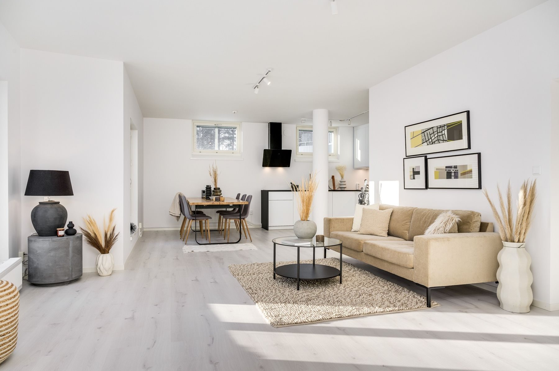 Ljusgråa trämönstrade laminatgolv och vitmålade väggar. Laminatgolven har försetts med ett ventilerande nivellsystem för att säkerställa att bostaden håller ett optimalt klimat.