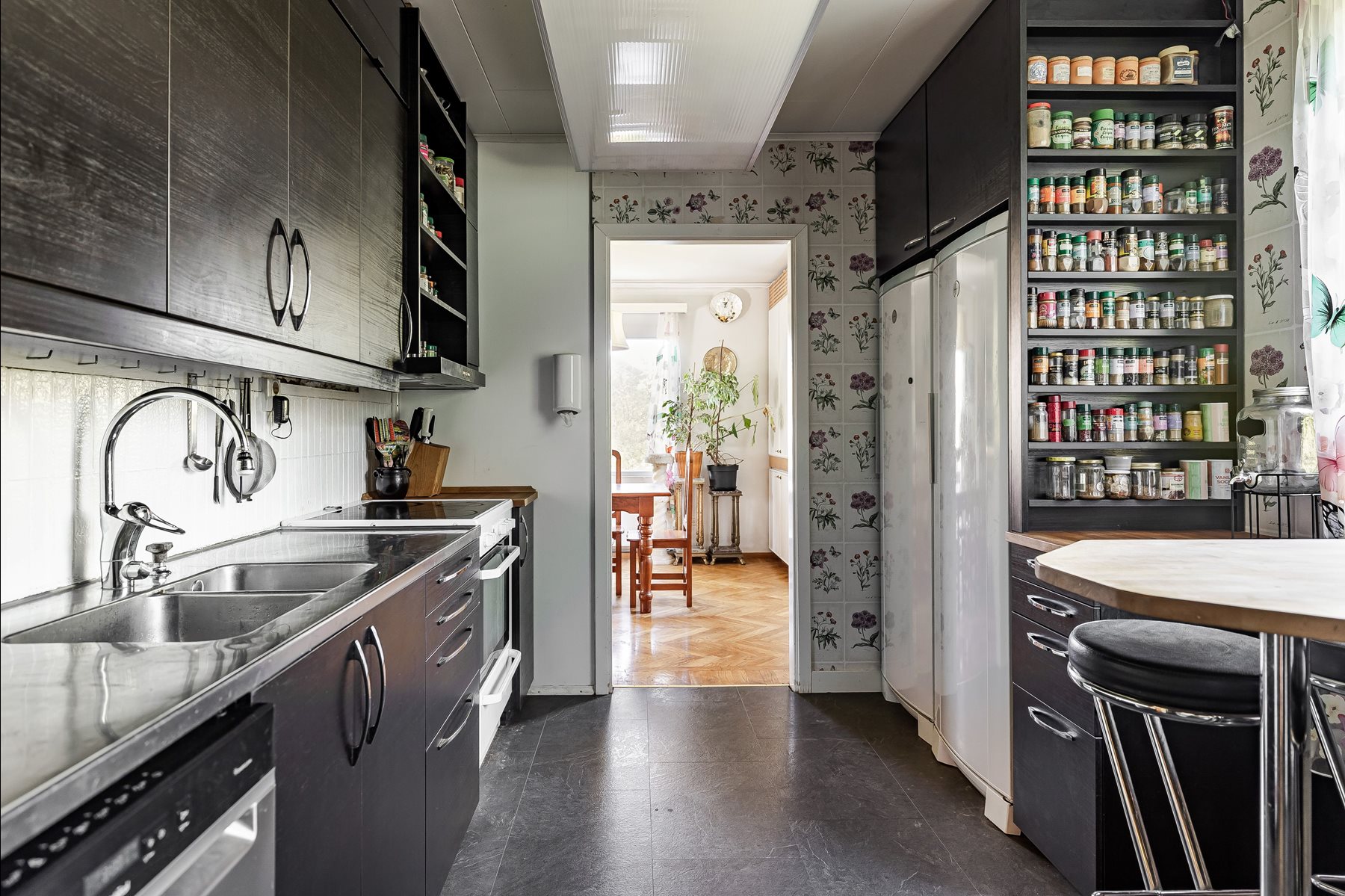 Ett smakfullt mörkt kök från 2015, där funktion möter design. Gott om förvaring finns i både skåp och lådor, och utrustningen är komplett med ugn, induktionshäll, diskmaskin, mikro, fläkt, kyl och frys. Köksbord med plats för fyra barstolar blir hemmets naturliga samlingspunkt. Bänkskiva i massiv bok och rostfritt stål kombineras med vitkaklat stänkskydd och en mönstrad tapet som ger rummet personlighet.
