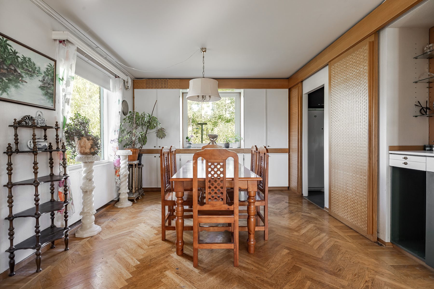 Ett rum fyllt av ljus och rymd, där fiskbensparketten harmonierar med de ljusa vävtapeterna. Stora fönsterpartier bjuder in gårdens grönska och skapar en härlig atmosfär. Här finns en charmig täljstenskamin som sprider värme och stämning under kyligare dagar. Platsbyggda förvaringslösningar ansluter till matrummet, som enkelt kan skiljas av från köket med skjutdörrar. Från vardagsrummet nås en rymlig balkong med stenplattor, markis och glasräcke – en plats för både morgonkaffet och sommarens middagar. En trappa leder dig vidare ner till gården.